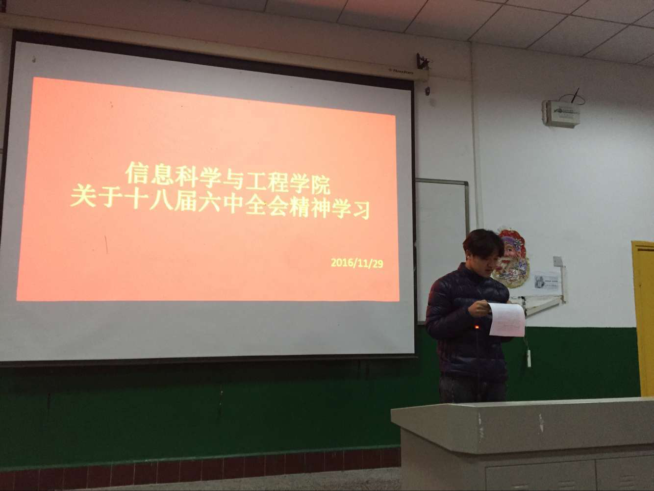 本网讯(员工记者 欧阳钰洁)11月29日晚,信息科学与工程学院员工党支部组织员工党员开展关于十八届六中全会精神的学习,集体学习研讨深入贯彻从严治党,严肃党内生活的重要意义。