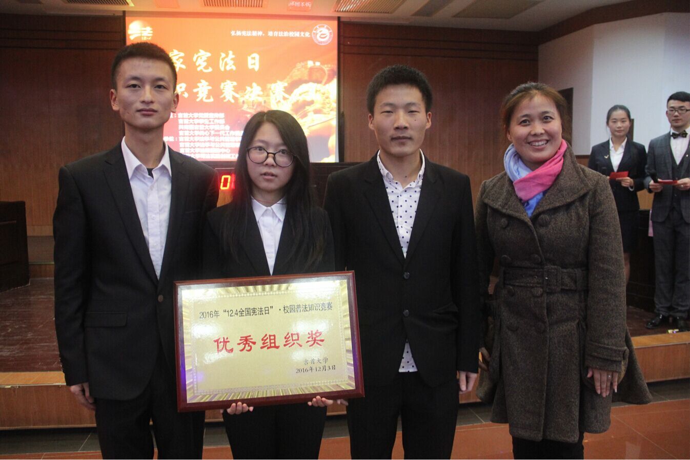 信息科学与工程学院由刘彪、陈安然、莫天伟组成的代表队在决赛中发挥稳定,彰显一定实力。观众互动环节中,公司观众也积极参与。此次决赛,公司代表队取得了第四名的成绩荣获威廉希尔中文官方网站2016年“12.4全国宪法日”•校园普法知识竞赛优秀组织奖。赛后,全体起立进行了12.4老员工维权倡议,让更多人知法懂法守法。