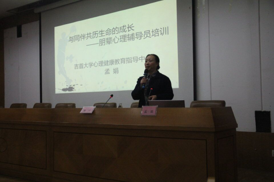 在此次讲座中孟老师以“什么是朋辈辅导员”,“为什么需要朋辈辅导员”、“朋辈辅导员该做什么怎么做”等一系列问题展开讲解。强调了朋辈心理辅导是一种新型的建设性的人际关系,是同伴之间运用一定专业知识和助人技巧进行的同龄人之间的心理互助、激励、指导等。指出了朋辈辅导员要有极强的观察性,敏捷性,要注意特殊时期,关注特殊人群。