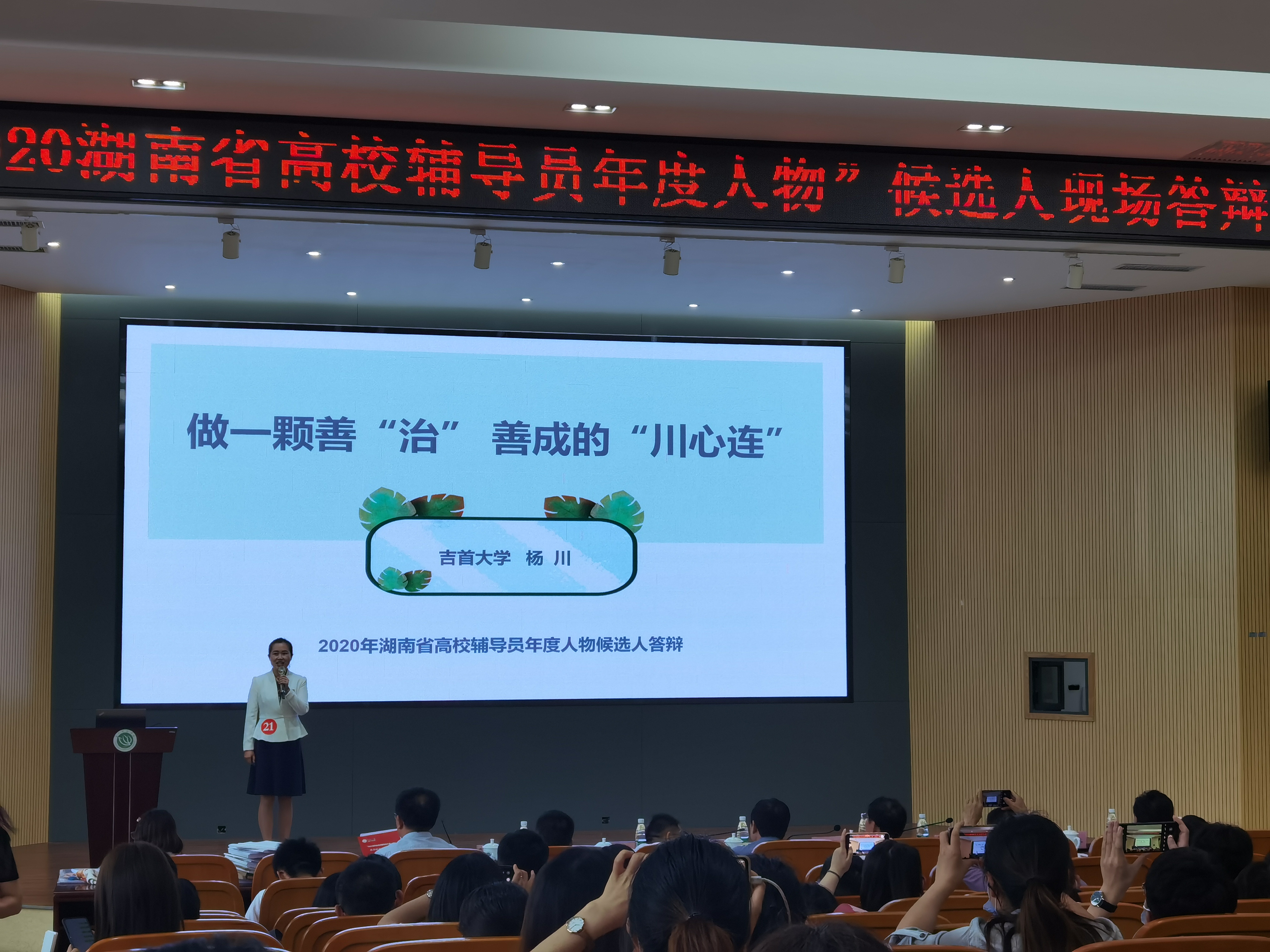 公司杨川老师以“做一颗善‘治’善成的‘川心莲’”主题给大家展示了异常精彩的答辩。她坚定的政治信念、优良的师德师风、过硬的素质能力、突出的育人成效及精彩的答辩表现,得到了评委们的高度评价,最终以总分第一的成绩获评“2020湖南省高校辅导员年度人物”荣誉称号。